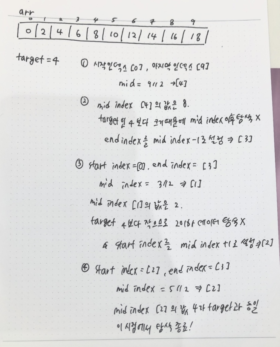 - 중간 인덱스의 값과 찾으려는 값이 같아질 때까지 2와 3의 과정을 반복함